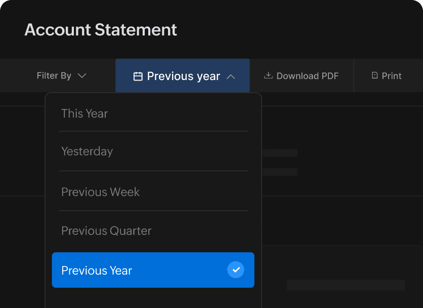 Your customers get a clear account overview, including the total due and credit. Further, they may download or print individual transactions or a consolidated, all-inclusive statement of account by themselves.